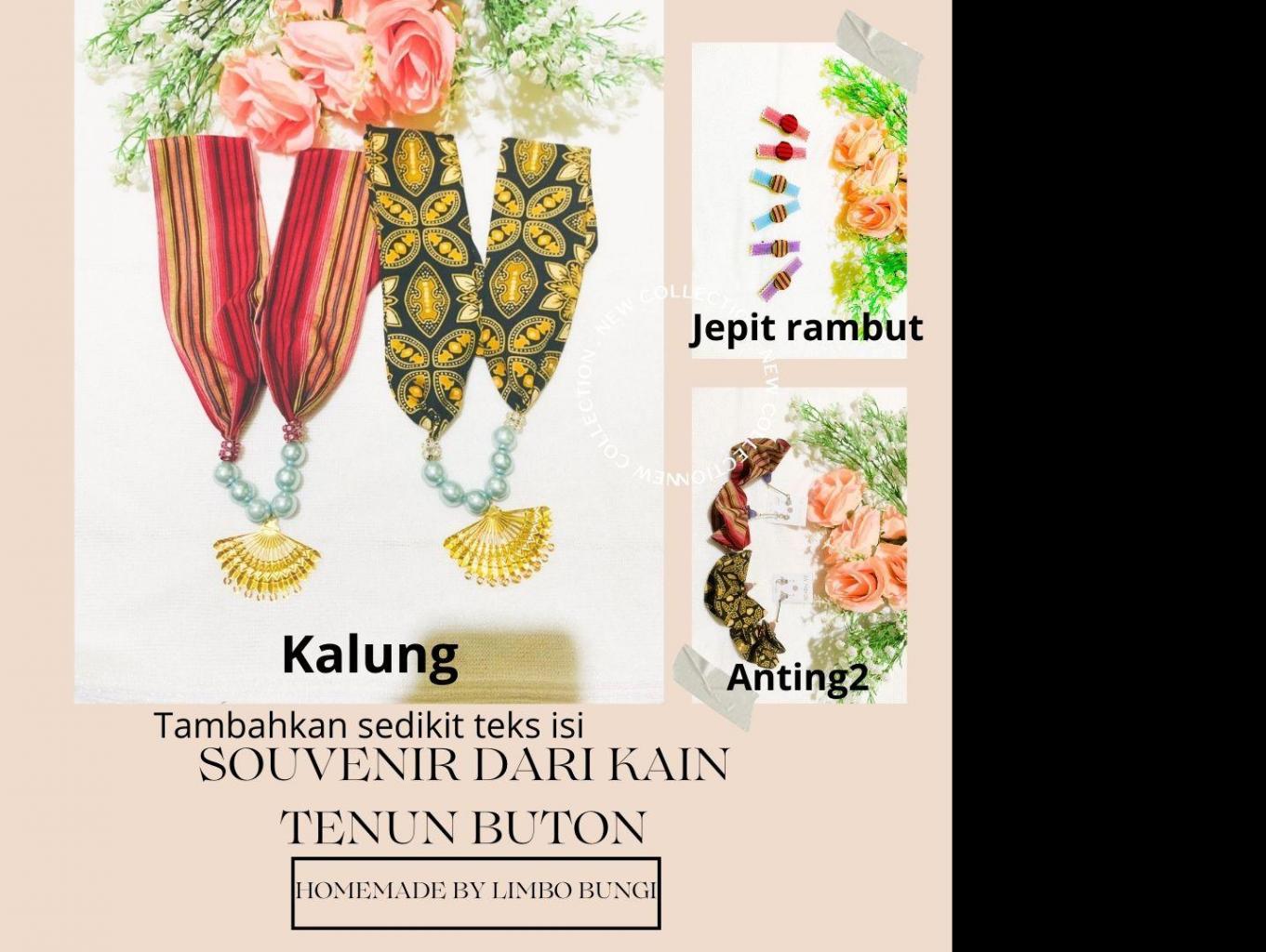 Souvenir kalung, anting-anting dan penjempit rambut yang berbahan kain tenun yang merupakan salah hasil kerajinan tenun dari Masyarakat Limbo Bungi, Kain Tenun Buton ini dikreasikan oleh muda-mudi Lakologou yang juga merupakan anggota Pokdarwis.