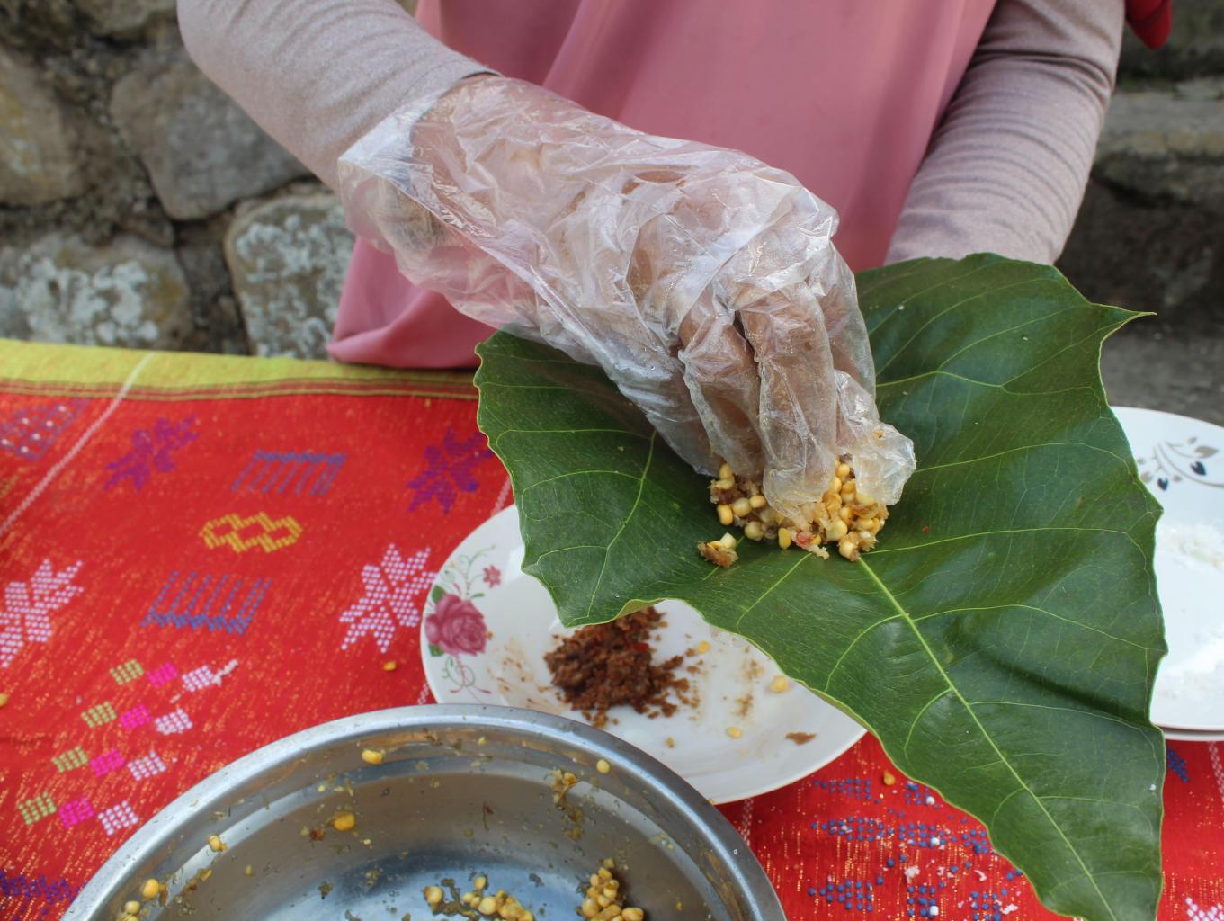 - Siapkan daun kemiri, sebagai pembungkus makanan, taruh campuran bahan diatas kedalam daun kemiri, lipat satu persatu-satu;